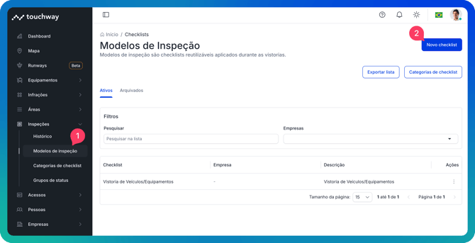 No menu lateral, selecione Inspeções > Modelos. Essa página exibe todos os checklists existentes e traz um botão “Novo checklist”.