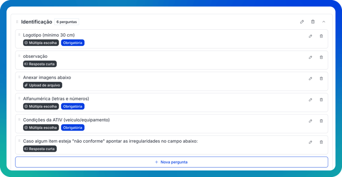 Adicione os itens de verificação que compõem a inspeção. Para cada item, informe a pergunta ou a tarefa (por exemplo, “Verificar nível de combustível”, “Inspecionar estado dos pneus”) e, opcionalmente, anexe orientações ou critérios de aceitação.