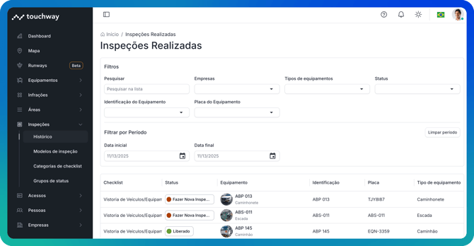 No menu lateral da plataforma Touchway, abra Inspeções > Histórico (ou Histórico de inspeções). Ali você verá uma tabela com todas as inspeções realizadas, listando o checklist utilizado, o status final, o equipamento inspecionado, a identificação, a placa e o tipo de veículo.